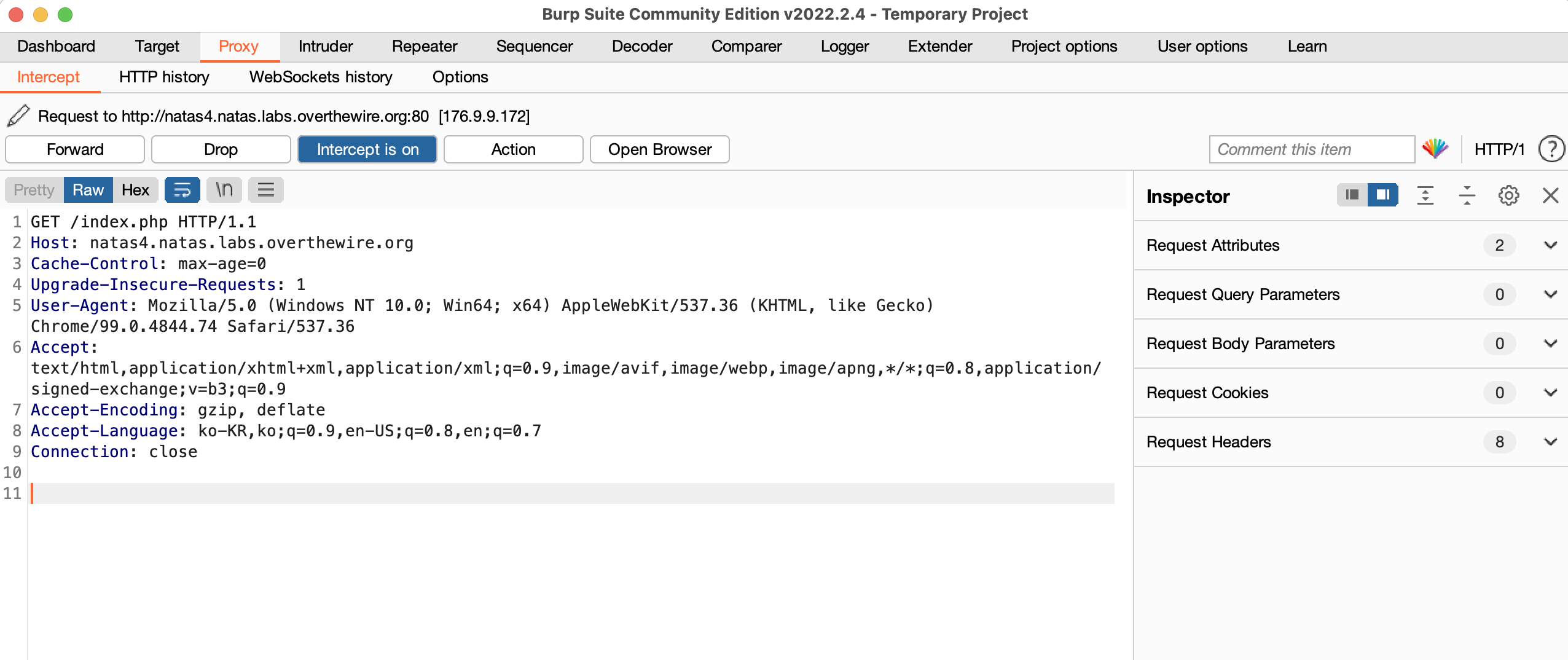 설정이 끝났으면 확인을 누르고 적용을 해준 후 Burp Suite를 실행하여 상단에 Proxy를 누르고 Intercept is on으로 바꿔주고 Open browser를 통해 브라우저를 열어 http://natas4.natas.labs.overthewire.org를 uri에 입력해주면 다음 화면으로 실행이 안 될텐데 그 때 Forward를 눌러준다.