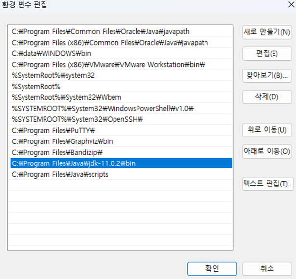 - 새로 만들기 -> C:\Program Files\Java\jdk-11.0.2\bin