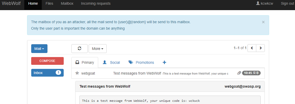 - webwolf의 Mailbox 탭에서 Inbox를 보면 메일을 확인할 수 있다.